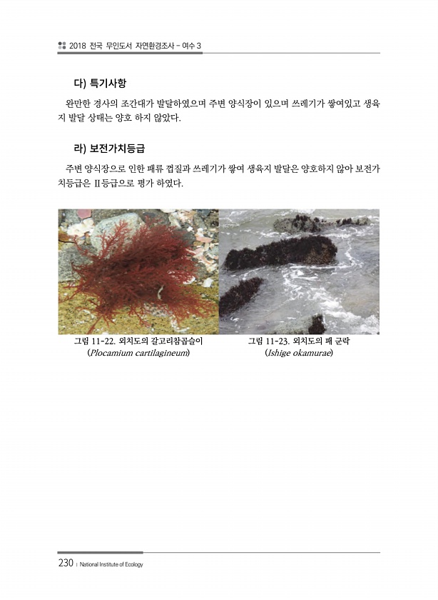 2018 전국 무인도서 자연환경조사 여수 3 230 ? National Institute of Ecology 완만한 경사의 조간대가 발달하였으며 주변 양식장이 있으며 쓰레기가 쌓여있고 생육 지 발달 상태는 양호 하지 않았다. 주변 양식장으로 인한 패류 껍질과 쓰레기가 쌓여 생육지 발달은 양호하지 않아 보전가 치등급은 Ⅱ등급으로 평가 하였다. 그림 11-22. 외치도의 갈고리참곱슬이 Plocamium cartilagineum 그림 11-23. 외치도의 패 군락 Ishige okamurae