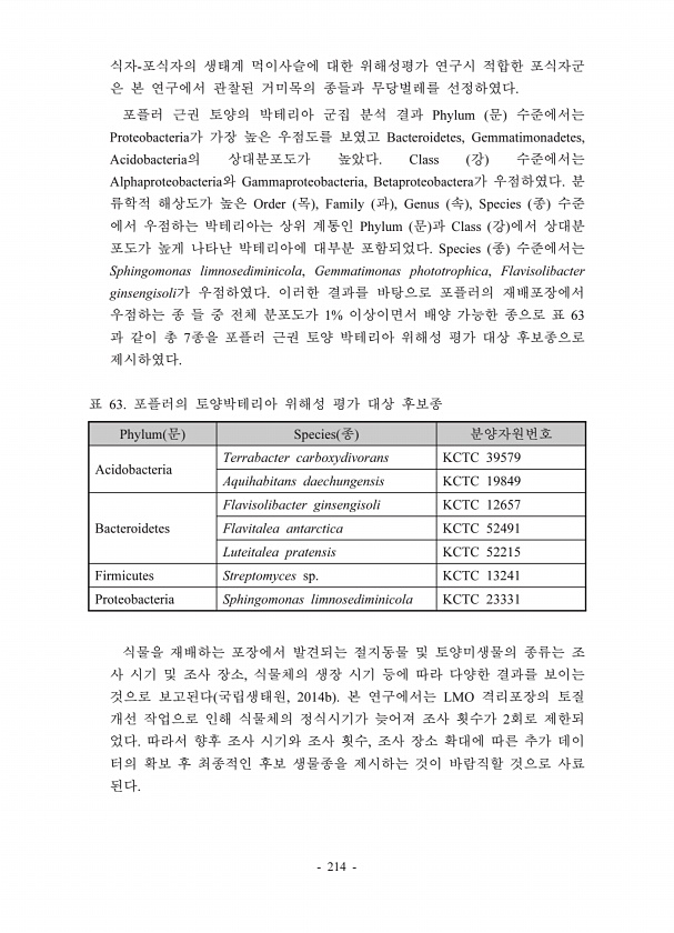 214 Phylum Proteobacteria Bacteroidetes, Gemmatimonadetes, Acidobacteria Class Alphaproteobacteria Gammaproteobacteria, Betaproteobactera Order , Family , Genus , Species Phylum Class Species Sphingomonas limnosediminicola, Gemmatimonas phototrophica, Flavisolibacter ginsengisoli 1% 63 7 Phylum Species Acidobacteria Terrabacter carboxydivorans KCTC 39579 Aquihabitans daechungensis KCTC 19849 Bacte...