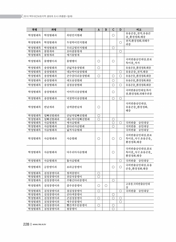 2016 백두대간보호지역 생태계 조사 추풍령밀재 228Ⅰwww.nie.re.kr 목명 과명 국명 A B C D 비고 딱정벌레목 딱정벌레과 폭탄먼지벌레 ○ 유용곤충_천적,유용곤 충_환경정화,해충 딱정벌레목 딱정벌레과 두점박이먼지벌레 ○ 천적,환경정화,위해우 려종 딱정벌레목 딱정벌레과 우리금빛먼지벌레 ○ 딱정벌레목 물방개과 꼬마줄물방개 ○ 딱정벌레목 물방개과 애기물방개 딱정벌레목 물땡땡이과 물땡땡이 ○ ○ 국외반출승인대상,분포 특이종_저서 딱정벌레목 송장벌레과 큰넓적송장벌레 ○ 유용곤충_환경정화,해충 딱정벌레목 송장벌레과 네눈박이송장벌레 ○ 유용곤충_천적,해충 딱정벌레목 송장벌레과 큰수중다리송장벌레 ○ ○ ○ 유용곤충_환경정화,해충 딱정벌레목 송장벌레과 대모송장벌레 ○ 유용곤충_환경정화,해충 딱정벌레목 송장벌레...