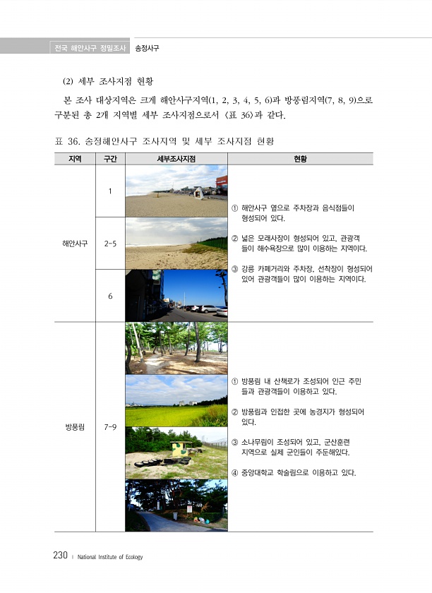 전국 해안사구 정밀조사 송정사구 230 ? National Institute of Ecology 2 세부 조사지점 현황 본 조사 대상지역은 크게 해안사구지역 1, 2, 3, 4, 5, 6 과 방풍림지역 7, 8, 9 으로 구분된 총 2개 지역별 세부 조사지점으로서 표 36 과 같다. 지역 구간 세부조사지점 현황 해안사구 1 ① 해안사구 옆으로 주차장과 음식점들이 형성되어 있다. ② 넓은 모래사장이 형성되어 있고, 관광객 들이 해수욕장으로 많이 이용하는 지역이다. ③ 강릉 카페거리와 주차장, 선착장이 형성되어 있어 관광객들이 많이 이용하는 지역이다. 2-5 6 방풍림 7-9 ① 방풍림 내 산책로가 조성되어 인근 주민 들과 관광객들이 이용하고 있다. ② 방풍림과 인접한 곳에 농경지가 형성되어 있다. ③ 소나무림...