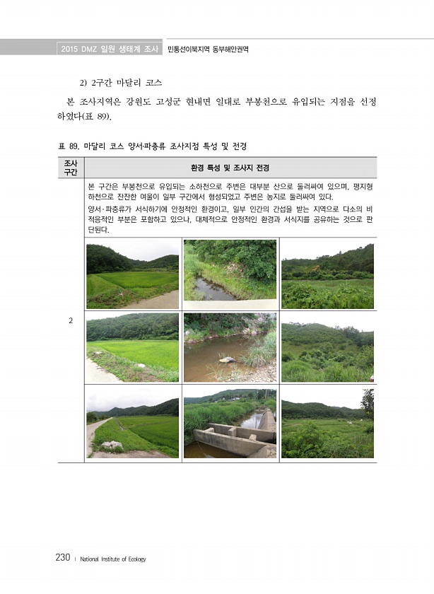 2015 DMZ 일원 생태계 조사 민통선이북지역 동부해안권역 230 ? National Institute of Ecology 2 2구간 마달리 코스 본 조사지역은 강원도 고성군 현내면 일대로 부봉천으로 유입되는 지점을 선정 하였다 표 89 조사 구간 환경 특성 및 조사지 전경 2 본 구간은 부봉천으로 유입되는 소하천으로 주변은 대부분 산으로 둘러싸여 있으며, 평지형 하천으로 잔잔한 여울이 일부 구간에서 형성되었고 주변은 농지로 둘러싸여 있다. 양서 ? 파충류가 서식하기에 안정적인 환경이고, 일부 인간의 간섭을 받는 지역으로 다소의 비 적응적인 부분은 포함하고 있으나, 대체적으로 안정적인 환경과 서식지를 공유하는 것으로 판 단된다. 표 89. 마달리 코스 양서?파충류 조사지점 특성 및전경