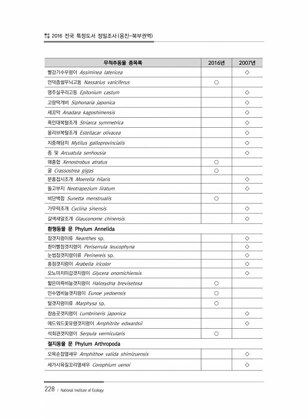 2016 전국 특정도서 정밀조사 옹진-북부권역 228 ? National Institute of Ecology 무척추동물 종목록 2016년 2007년 빨강기수우렁이 Assiminea latericea ◇ 언덕좁쌀무늬고둥 Nassarius variciferus ○ 명주실꾸리고둥 Epitonium castum ◇ 고랑딱개비 Siphonaria japonica ◇ 새꼬막 Anadara kagoshimensis ◇ 흑인대복털조개 Striarca symmetrica ◇ 올리브복털조개 Estellacar olivacea ◇ 지중해담치 Mytilus galloprovincialis ◇ 종 및 Arcuatula senhousia ◇ 왜홍합 Xenostrobus atratus ○ 굴 Crassostrea gigas ○ 분홍...