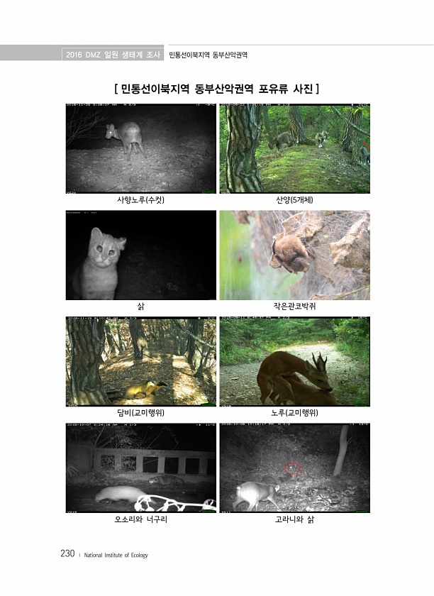 2016 DMZ 일원 생태계 조사 민통선이북지역 동부산악권역 230 ? National Institute of Ecology [ 민통선이북지역 동부산악권역 포유류 사진 ] 사향노루 수컷 산양 5개체 삵 작은관코박쥐 담비 교미행위 노루 교미행위 오소리와 너구리 고라니와삵