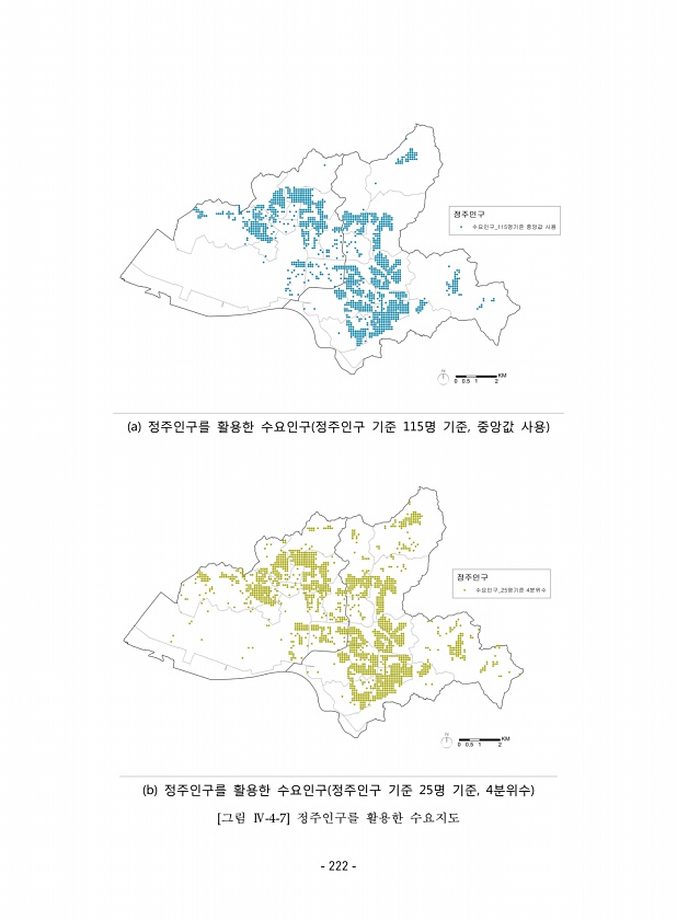 a 정주인구를 활용한 수요인구 정주인구 기준 115명 기준, 중앙값 사용 b 정주인구를 활용한 수요인구 정주인구 기준 25명 기준, 4분위수 [그림 Ⅳ-4-7] 정주인구를 활용한 수요지도 222