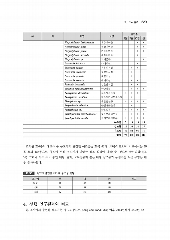 Ⅱ. 조사결과 229 조사된 230종의 해조류 중 동도에서 관찰된 해조류는 26목 43과 149종이었으며, 서도에서는 29 목 51과 186종으로, 동도에 비해 서도에서 다양한 해조 식생이 나타나는 것으로 확인되었다 표 55 그러나 독도 주요 종인 대황, 감태, 모자반류와 같은 대형 갈조류가 우점하는 식생 유형은 매 우 유사하였다. 조사지 목 과 종 비고 동도 26 43 149 서도 29 51 186 전체 32 57 230 표 55 독도에 출현한 해조류 종조성 현황 4. 선행 연구결과와 비교 본 조사에서 출현한 해조류는 총 230종으로 Kang and Park 1969 이후 2014년까지 보고된 42∼ 목 과 학명 국명 출현종 5월 7월 10월 1월 Herposiphonia fissidentoides 제주거...