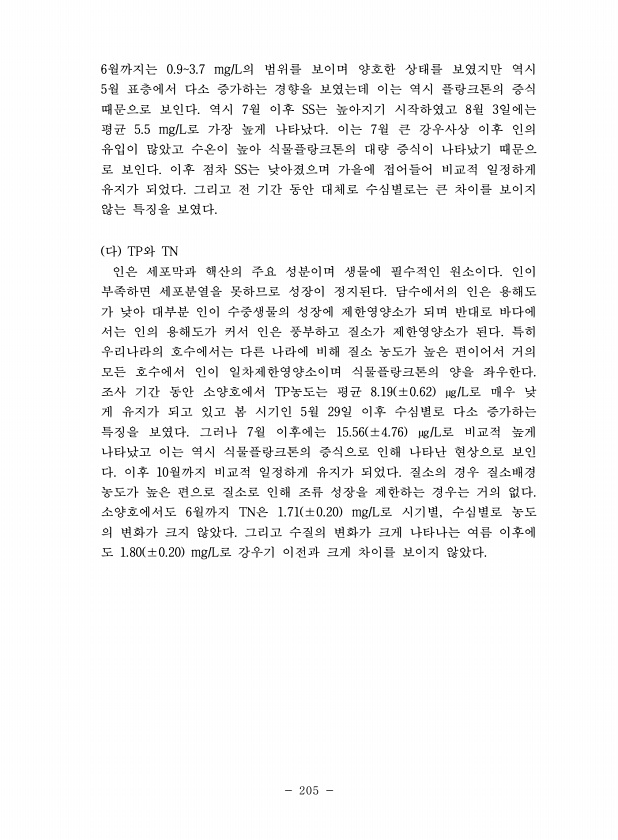 205 6월까지는 0.93.7 mg/L의 범위를 보이며 양호한 상태를 보였지만 역시 5월 표층에서 다소 증가하는 경향을 보였는데 이는 역시 플랑크톤의 증식 때문으로 보인다. 역시 7월 이후 SS는 높아지기 시작하였고 8월 3일에는 평균 5.5 mg/L로 가장 높게 나타났다. 이는 7월 큰 강우사상 이후 인의 유입이 많았고 수온이 높아 식물플랑크톤의 대량 증식이 나타났기 때문으 로 보인다. 이후 점차 SS는 낮아졌으며 가을에 접어들어 비교적 일정하게 유지가 되었다. 그리고 전 기간 동안 대체로 수심별로는 큰 차이를 보이지 않는 특징을 보였다. 다 TP와 TN 인은 세포막과 핵산의 주요 성분이며 생물에 필수적인 원소이다. 인이 부족하면 세포분열을 못하므로 성장이 정지된다. 담수에서의 인은 용해도 가 낮아 대부분...