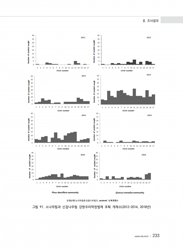 Ⅱ. 조사결과 www.nie.re.kr ? 233 그림 91. 소나무림과 신갈나무림 강원우리딱정벌레 포획 개체수 2012-2014, 2018년