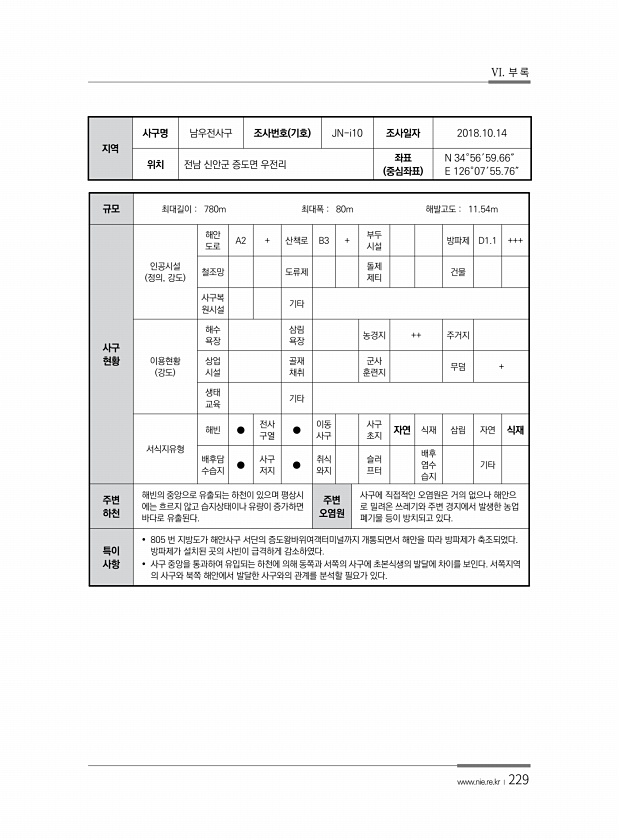 VI. 부 록 www.nie.re.kr ?229 지역 사구명 남우전사구 조사번호 기호 JN-i10 조사일자 2018.10.14 위치 전남 신안군 증도면 우전리 좌표 중심좌표 N 34°56′59.66″ E 126°07′55.76″ 규모 최대길이 780m 최대폭 80m 해발고도 11.54m 사구 현황 인공시설 정의, 강도 해안 도로 A2 + 산책로 B3 + 부두 시설 방파제 D1.1 +++ 철조망 도류제 돌제 제티 건물 사구복 원시설 기타 이용현황 강도 해수 욕장 삼림 욕장 농경지 ++ 주거지 상업 시설 골재 채취 군사 훈련지 무덤 + 생태 교육 기타 서식지유형 해빈 ● 전사 구열 ● 이동 사구 사구 초지 자연 식재 삼림 자연 식재 배후담 수습지 ● 사구 저지 ● 취식 와지 슬러 프터 배후 염수 습지 기타 주변...