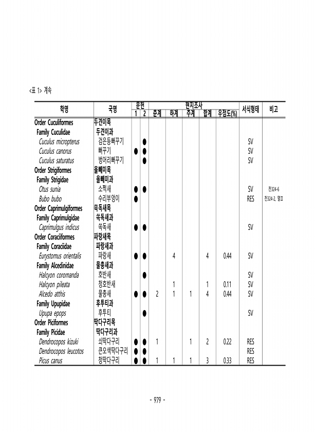 979 표 1 계속 학명 국명 문헌 현지조사 서식형태 비고 1 2 춘계 하계 추계 합계 우점도 % Order Cuculiformes 두견이목 Family Cuculidae 두견이과 Cuculus micropterus 검은등뻐꾸기 ● SV Cuculus canorus 뻐꾸기 ● ● SV Cuculus saturatus 벙어리뻐꾸기 ● SV Order Strigiformes 올빼미목 Family Strigidae 올빼미과 Otus sunia 소쩍새 ● ● SV 천324-6 Bubo bubo 수리부엉이 ● RES 천324-2, 멸Ⅱ Order Caprimulgiformes 쏙독새목 Family Caprimulgidae 쏙독새과 Caprimulgus indicus 쏙독새 ● ● SV Order Coraciiform...