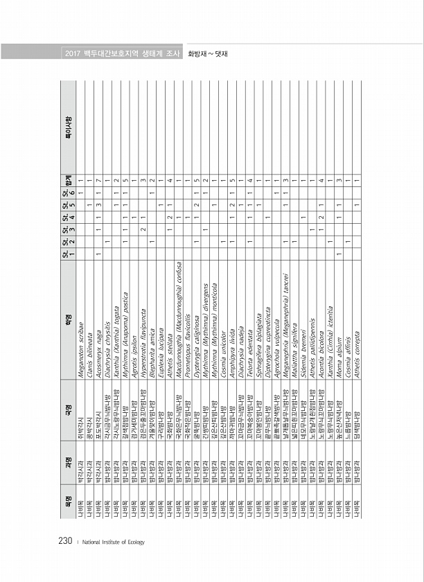 230 목명 과명 국명 학명 St. 1 St. 2 St. 3 St. 4 St. 5 St. 6 합계 특이사항 나비목 박각시과 쥐박각시 Meganoton scribae 1 1 나비목 박각시과 콩박각시 Clanis bilineata 1 1 나비목 박각시과 포도박각시 Acosmeryx naga 1 1 1 3 1 7 나비목 밤나방과 각시금무늬밤나방 Diachrysia chrysitis 1 1 나비목 밤나방과 각시노랑무늬밤나방 Xanthia Xanthia togata 1 1 2 나비목 밤나방과 갈색점밤나방 Mythimna Anapoma postica 1 1 1 1 1 5 나비목 밤나방과 검거세미밤나방 Agrotis ipsilon 1 1 나비목 밤나방과 검은두줄꼬마밤나방 Hyperstrotia flavipuncta 2 ...