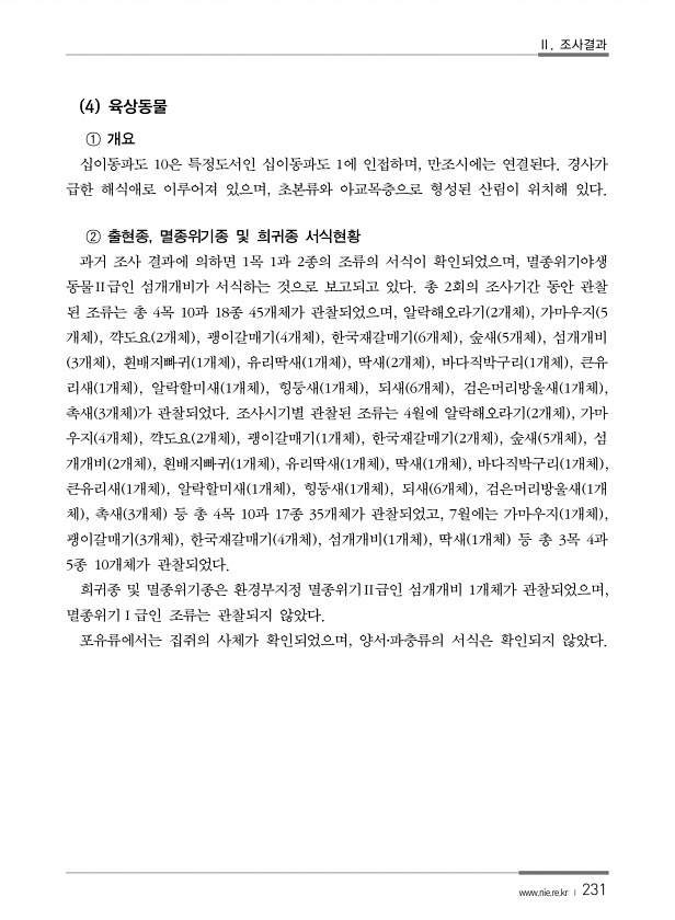 Ⅱ. 조사결과 www.nie.re.kr ? 231 4 육상동물 ① 개요 십이동파도 10은 특정도서인 십이동파도 1에 인접하며, 만조시에는 연결된다. 경사가 급한 해식애로 이루어져 있으며, 초본류와 아교목층으로 형성된 산림이 위치해 있다. ② 출현종, 멸종위기종 및 희귀종 서식현황 과거 조사 결과에 의하면 1목 1과 2종의 조류의 서식이 확인되었으며, 멸종위기야생 동물Ⅱ급인 섬개개비가 서식하는 것으로 보고되고 있다. 총 2회의 조사기간 동안 관찰 된 조류는 총 4목 10과 18종 45개체가 관찰되었으며, 알락해오라기 2개체 , 가마우지 5 개체 , 꺅도요 2개체 , 괭이갈매기 4개체 , 한국재갈매기 6개체 , 숲새 5개체 , 섬개개비 3개체 , 흰배지빠귀 1개체 , 유리딱새 1개체 , 딱새 2개체 , 바다직박...
