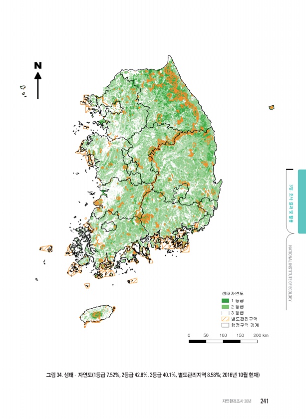 그림 34. 생태 · 자연도 1등급 7.52%, 2등급 42.8%, 3등급 40.1%, 별도관리지역 8.58%; 2016년 10월 현재 3장. 조사 결과 및 활용 NATIONAL INSTITUTE OF ECOLOGY 자연환경조사 30년241