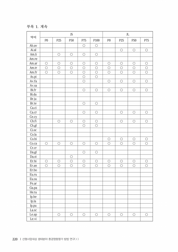 약어 JS JL P0 P25 P50 P75 P100 P0 P25 P50 P75 Ab.av ○ ○ Ai.al ○ ○ ○ Am.li ○ ○ ○ ○ Am.re Am.ar ○ ○ ○ ○ ○ ○ ○ ○ ○ Am.tr ○ ○ ○ ○ ○ ○ ○ ○ ○ Am.fr ○ ○ ○ ○ ○ ○ ○ ○ ○ As.pi ○ ○ Av.fa ○ ○ ○ ○ ○ Av.sa Bi.fr ○ ○ ○ ○ ○ ○ Bi.du Br.ju Br.te ○ ○ Ca.ci Ca.cr ○ ○ ○ ○ ○ Ce.cy Ch.fi ○ ○ ○ ○ ○ ○ ○ Ch.gl ○ ○ Ci.oc Co.la Co.bi ○ ○ ○ ○ Co.ca ○ ○ ○ ○ ○ ○ ○ ○ ○ Cr.cr Da.gl ○ ○ Da.st ○ Er.hi ○ ○ ○ ○ ○ ○ ○ ○ ○ Er.an ○ ○ ○ ○ ...