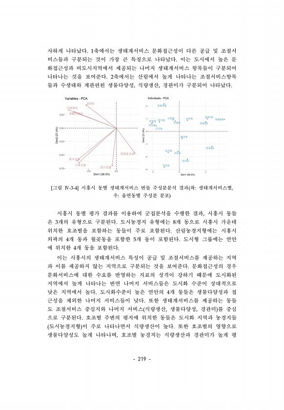 219 사하게 나타났다. 1축에서는 생태계서비스 문화접근성이 다른 공급 및 조절서 비스들과 구분되는 것이 가장 큰 특징으로 나타났다. 이는 도시에서 높은 문 화접근성과 비도시지역에서 제공되는 나머지 생태계서비스 항목들이 구분되어 나타나는 것을 보여준다. 2축에서는 산림에서 높게 나타나는 조절서비스항목 들과 수생태와 계관련된 생물다양성, 식량생산, 경관미가 구분되어 나타났다. [그림 Ⅳ-3-4] 시흥시 동별 생태계서비스 번들 주성분분석 결과 좌생태계서비스별, 우읍면동별 주성분 분포 시흥시 동별 평가 결과를 이용하여 군집분석을 수행한 결과, 시흥시 동들 은 3개의 유형으로 구분된다. 도시농경지 유형에는 8개 동으로 시흥시 가운데 위치한 호조벌을 포함하는 동들이 주로 포함된다. 산림농경지형에는 시흥시 외곽의 4개...