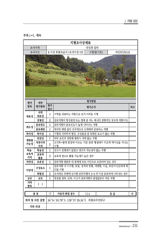 i. 지형·경관 www.nie.re.kr ?231 지형조사상세표 조사지역 내성천 일대 조사구간 8 구간 회룡포습지 조사지점 19 지형명 기호 하안단구 GS 평가 항목 세부 평가항목 평가방법 평가 점수 평가근거 비고 대표성 지역 대표성 1 지역을 대표하는 지형으로 보기 어려운 지형 전형성 2 단위지형의 형성원인 또는 형태 중 어느 하나만 전형적인 경우의 지형이다. 희소성 분포빈도 1 단위지형의 분포빈도가 높게 나타나는 지형 분포패턴 1 특이한 패턴 없이 전국적으로 산재하여 분포하는 지형 특이성 특이성 1 지형의 기하학적 형상, 구성물질 중 독특한 요소가 없는 지형 재현불 가능성 민감성 1 외부 요인의 영향에 변화가 거의 없는 지형 자연사적 가치 2 고기후현재 환경에 이르는 기간 동안 형성되어 비교적 역사성을 ...
