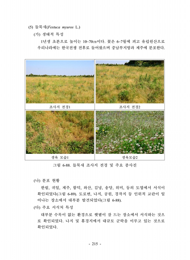 215 5 들묵새 Festuca myuros L. 가 생태적 특성 1년생 초본으로 높이는 1070㎝이다. 꽃은 67월에 피고 유럽원산으로 우리나라에는 한국전쟁 전후로 들어왔으며 중남부지방과 제주에 분포한다. 조사지 전경1 조사지 전경2 생육 모습1 생육모습2 그림 6-88. 들묵새 조사지 전경 및 주요 종사진 나 분포 현황 한림, 귀일, 제주, 함덕, 와산, 김녕, 송당, 위미, 등의 도엽에서 서식이 확인되었다 그림 6-89 도로변, 나지, 공원, 경작지 등 인위적 교란이 일 어나는 장소에서 대부분 발견되었다 그림 6-88 다 주요 서식처 특성 대부분 수목이 없는 환경으로 햇볕이 잘 드는 장소에서 서식하는 것으 로 확인되었다. 나지 및 휴경지에서 대규모 군락을 이루고 있는 것으로확인되었다.