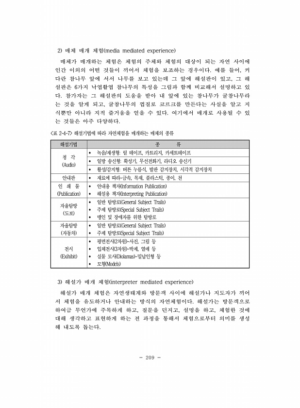 209 2 매체 매개 체험 media mediated experience 매체가 매개하는 체험은 체험의 주체와 체험의 대상이 되는 자연 사이에 인간 이외의 어떤 것들이 끼어서 체험을 보조하는 경우이다. 예를 들어, 커 다란 참나무 앞에 서서 나무를 보고 있는데 그 앞에 해설판이 있고, 그 해 설판은 6가지 낙엽활엽 참나무의 특성을 그림과 함께 비교해서 설명하고 있 다. 참가자는 그 해설판의 도움을 받아 내 앞에 있는 참나무가 굴참나무라 는 것을 알게 되고, 굴참나무의 껍질로 코르크를 만든다는 사실을 알고 지 식뿐만 아니라 지적 즐거움을 얻을 수 있다. 여기에서 매개로 사용될 수 있 는 것들은 아주 다양하다. 해설기법 종 류 청 각 Audio ? 녹음/재생형릴 테이프, 카트리지, 카세트테이프 ? 일방 송신형확...
