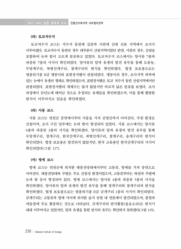 2017 DMZ 일원 생태계 조사 민통선이북지역 서부평야권역 230 ? National Institute of Ecology 라 토교저수지 토교저수지 코스는 저수지 동편에 길골과 서편에 신대 신촌 지역에서 조사가 이루어졌다. 토교저수지 동편의 경우 대부분이 산림지역이었던 반면, 서편의 경우, 산림을 포함하여 논과 밭이 고르게 분포하고 있었다. 토교저수지 코스에서는 양서류 7종과 파충류 7종의 서식이 확인되었다. 양서류의 알과 유생의 발견 유무를 통해 도롱뇽, 무당개구리, 북방산개구리, 참개구리의 번식을 확인하였다. 법정 보호종으로는 멸종위기종 II급 맹꽁이와 표범장지뱀이 관찰되었다. 맹꽁이의 경우, 조사지역 외곽에 있는 논에서 유생의 형태로 확인하였으며, 표범장지뱀은 토교 저수지 동편 산림지역에서만 관찰되었...