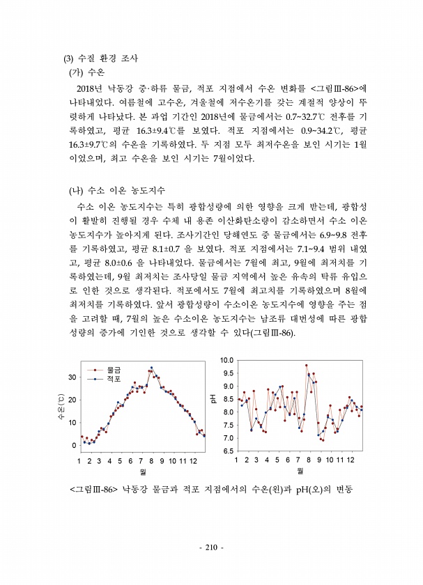 210 3 수질 환경 조사 가 수온 2018년 낙동강 중·하류 물금, 적포 지점에서 수온 변화를 그림Ⅲ-86 에 나타내었다. 여름철에 고수온, 겨울철에 저수온기를 갖는 계절적 양상이 뚜 렷하게 나타났다. 본 과업 기간인 2018년에 물금에서는 0.732.7℃ 전후를 기 록하였고, 평균 16.3±9.4℃를 보였다. 적포 지점에서는 0.934.2℃, 평균 16.3±9.7℃의 수온을 기록하였다. 두 지점 모두 최저수온을 보인 시기는 1월 이었으며, 최고 수온을 보인 시기는 7월이었다. 나 수소 이온 농도지수 수소 이온 농도지수는 특히 광합성량에 의한 영향을 크게 받는데, 광합성 이 활발히 진행될 경우 수체 내 용존 이산화탄소량이 감소하면서 수소 이온 농도지수가 높아지게 된다. 조사기간인 당해연도 중 물금에서는 6...