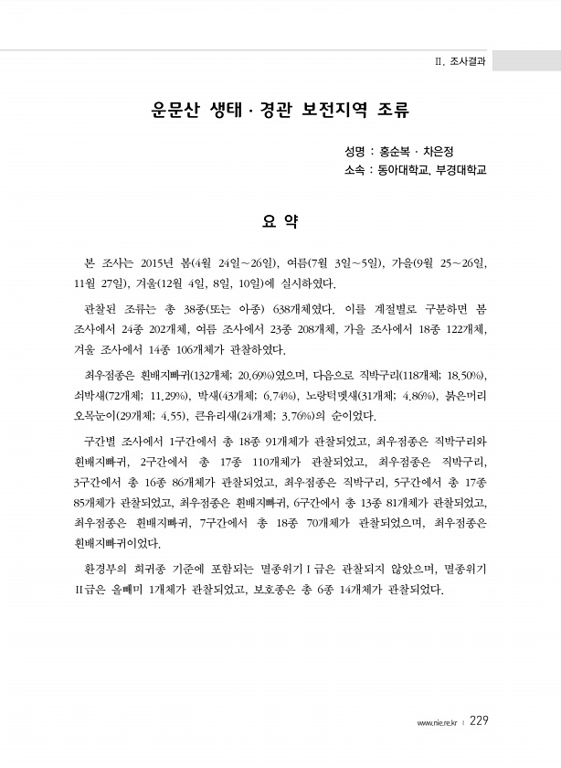 Ⅱ. 조사결과 www.nie.re.kr ? 229 운문산 생태·경관 보전지역 조류 성명 홍순복 ? 차은정 소속 동아대학교, 부경대학교 요 약 본 조사는 2015년 봄 4월 24일∼26일 , 여름 7월 3일∼5일 , 가을 9월 25∼26일, 11월 27일 , 겨울 12월 4일, 8일, 10일 에 실시하였다. 관찰된 조류는 총 38종 또는 아종 638개체였다. 이를 계절별로 구분하면 봄 조사에서 24종 202개체, 여름 조사에서 23종 208개체, 가을 조사에서 18종 122개체, 겨울 조사에서 14종 106개체가 관찰하였다. 최우점종은 흰배지빠귀 132개체; 20.69% 였으며, 다음으로 직박구리 118개체; 18.50% , 쇠박새 72개체; 11.29% , 박새 43개체; 6.74% , 노랑턱멧새 31개체;...