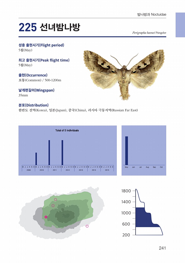 241 밤나방과 Noctuidae Perigrapha hoenei P?ngeler 성충 출현시기 Flight period 5월 May 최고 출현시기 Peak fight time 5월 May 출현 Occurrence 보통 Common 500-1200m 날개편길이 Wingspan 35mm 분포 Distribution 한반도 전역 Korea , 일본 Japan , 중국 China , 러시아 극동지역 Russian Far East 225 선녀밤나방 M J J A S O M J J A S O M J J A S O M J J A S O M J J A S O M J J A S O M J J A S O May Jun Jul Aug Sep Oct 2009 2010 2011 2012 2013 2014 2015 Total of...