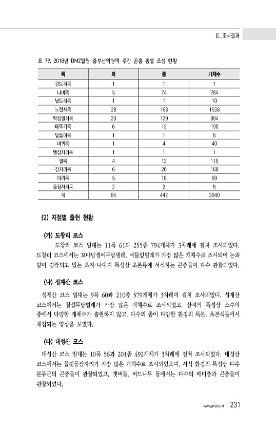 Ⅱ. 조사결과 www.nie.re.kr ? 231 목 과 종 개체수 강도래목 1 1 1 나비목 5 74 784 날도래목 1 1 10 노린재목 28 163 1538 딱정벌레목 23 129 894 메뚜기목 6 13 190 밑들이목 1 1 5 바퀴목 1 4 40 뱀잠자리목 1 1 1 벌목 4 13 115 잠자리목 6 20 168 파리목 5 18 89 풀잠자리목 2 2 5 계 84 442 3840 표 79. 2018년 DMZ일원 중부산악권역 주간 곤충 종별 조성 현황 2 지점별 출현 현황 가 도창리 코스 도창리 코스 일대는 11목 61과 255종 794개체가 3차례에 걸쳐 조사되었다. 도창리 코스에서는 꼬마남생이무당벌레, 버들잎벌레가 가장 많은 개체수로 조사되어 논과 밭이 경작되고 있는 초지·나대지 특성상 초본류에...