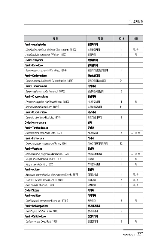 II. 조사결과 www.nie.re.kr ?227 학 명 국 명 2018 비고 Family Ascalaphidae 뿔잠자리과 Libelloides sibiricus sibiricus Eversmann, 1850 노랑뿔잠자리 1 국, 특 Ascalohybris subjacens Walker, 1853 뿔잠자리 1 국 Order Coleoptera 딱정벌레목 Family Elateridae 방아벌레과 Spheniscosomus cete Cand?ze, 1860 붉은다리빗살방아벌레 1 Family Oedemeridae 하늘소붙이과 Oedemeronia lucidicollis Motschulsky, 1866 알통다리하늘소붙이 24 Family Tenebrionidae 거저리과 Borboresthes cruralis...
