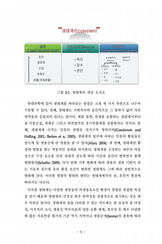 5 그림 생태계의 개념 모식도 현대과학에 있어 생태계를 바라보는 관점은 크게 세 가지 측면으로 나누어 구분할 수 있다 첫째 생태계는 가변적이며 공간적으로 그 범위가 넓어 다른 영역들과 중첩되어 있다는 점이다 예를 들면 전체를 포함하는 경관에서부터 동 식물군집 개체군 그리고 하위범주인 유기연합체를 포함한다는 것이다 둘 째 생태계에 미치는 인류의 영향은 전지구적 범위이며 생태계의 일부에 속하는 인류의 활동들은 담수계 및 생물군에 큰 영향을 줄 수 있다 세 번째 생태계란 환 경에 영향을 받는 역동적인 상태를 의미한다 생태계를 구성하는 내부의 역동 성으로 구성 요소들 간의 상대적 강도에 따라 시간과 공간이 변하면서 함께 변화한다 다시 말해 기후 변화에 따라 생물의 생존 기반이 되 는 기온과 강수량 등의 환경 조건이...