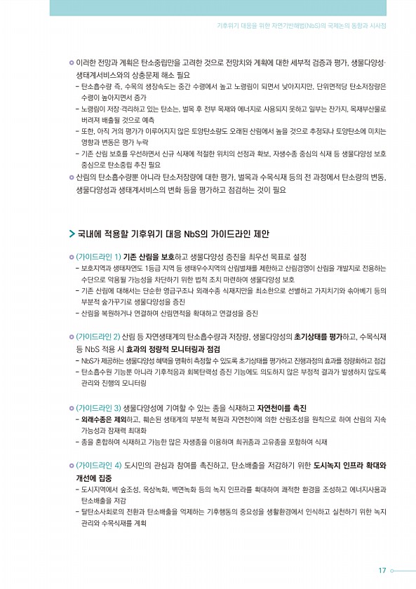 17 기후위기 대응을 위한 자연기반해법 NbS 의 국제논의 동향과 시사점 이러한 전망과 계획은 탄소중립만을 고려한 것으로 전망치와 계획에 대한 세부적 검증과 평가, 생물다양성· 생태계서비스와의 상충문제 해소 필요 탄소흡수량 즉, 수목의 생장속도는 중간 수령에서 높고 노령림이 되면서 낮아지지만, 단위면적당 탄소저장량은 수령이 높아지면서 증가 노령림이 저장·격리하고 있는 탄소는, 벌목 후 전부 목재와 에너지로 사용되지 못하고 일부는 잔가지, 목재부산물로 버려져 배출될 것으로 예측 또한, 아직 거의 평가가 이루어지지 않은 토양탄소량도 오래된 산림에서 높을 것으로 추정되나 토양탄소에 미치는 영향과 변동은 평가 누락 기존 산림 보호를 우선하면서 신규 식재에 적절한 위치의 선정과 확보, 자생수종 중심의 식재 등 생물다...
