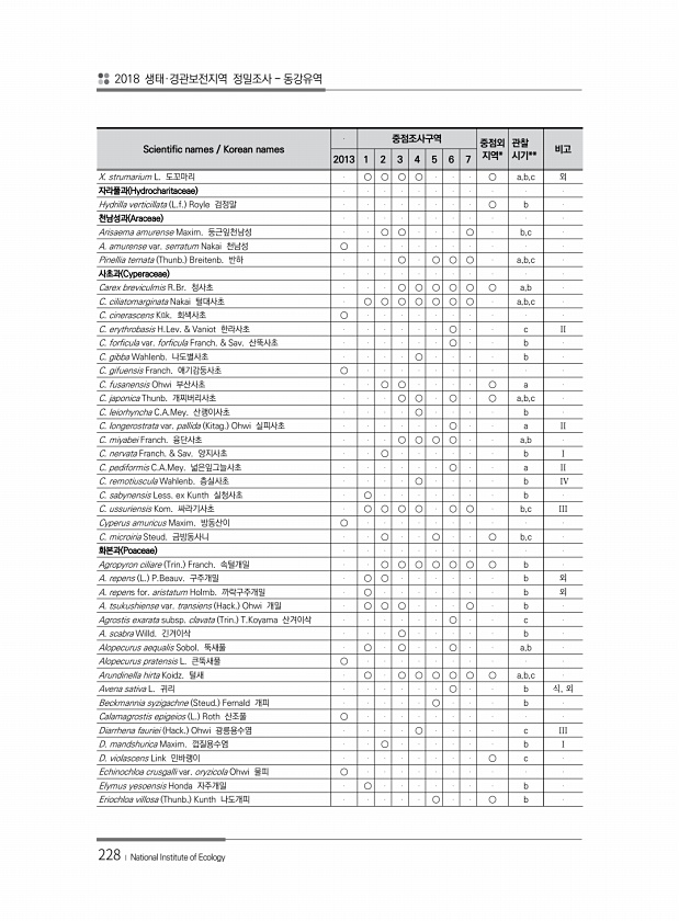 2018 생태·경관보전지역 정밀조사 동강유역 228 ? National Institute of Ecology Scientific names Korean names 중점조사구역 중점외 지역* 관찰 2013 1 2 3 4 5 6 7 시기** 비고 X. strumarium L. 도꼬마리 ○ ○ ○ ○ ○ a,b,c 외 자라풀과 Hydrocharitaceae Hydrilla verticillata L.f. Royle 검정말 ○ b 천남성과 Araceae Arisaema amurense Maxim. 둥근잎천남성 ○ ○ ○ b,c A. amurense var. serratum Nakai 천남성 ○ Pinellia...
