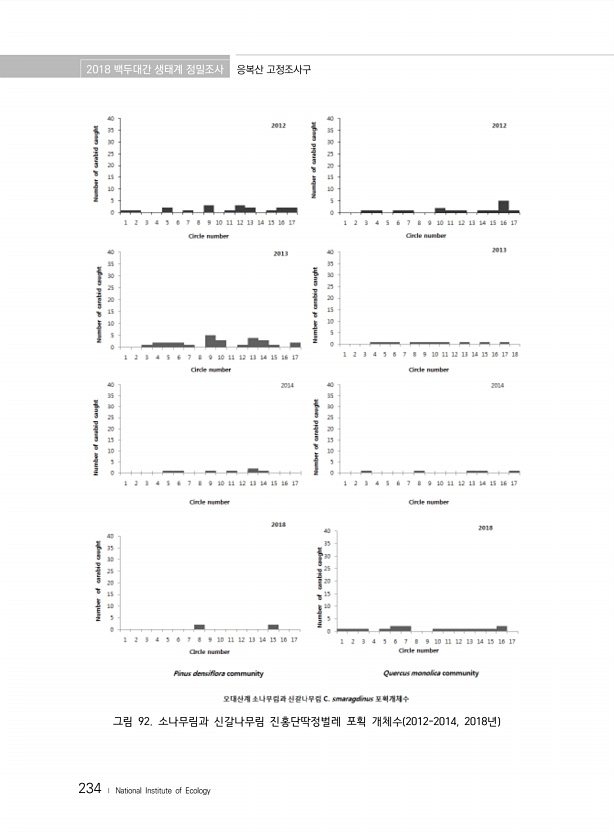 2018 백두대간 생태계 정밀조사 응복산 고정조사구 234 ? National Institute of Ecology 그림 92. 소나무림과 신갈나무림 진홍단딱정벌레 포획 개체수 2012-2014, 2018년