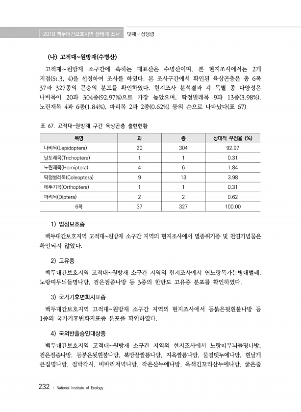 2018 백두대간보호지역 생태계 조사 댓재 삽당령 232 ? National Institute of Ecology 나 고적대원방재 수병산 고적재∼원방재 소구간에 속하는 대표산은 수병산이며, 본 현지조사에서는 2개 지점 St.3, 4 을 선정하여 조사를 하였다. 본 조사구간에서 확인된 육상곤충은 총 6목 37과 327종의 곤충의 분포를 확인하였다. 현지조사 분석결과 각 목별 종 다양성은 나비목이 20과 304종 92.97% 으로 가장 높았으며, 딱정벌레목 9과 13종 3.98% , 노린재목 4과 6종 1.84% , 파리목 2과 2종 0.62% 등의 순으로 나타났다 표 67 목명 과 종 상대적 우점율 % 나비목 Lepidoptera 20 304 92.97 날도래목 Trichoptera 1 1 0.31 노린재목 ...