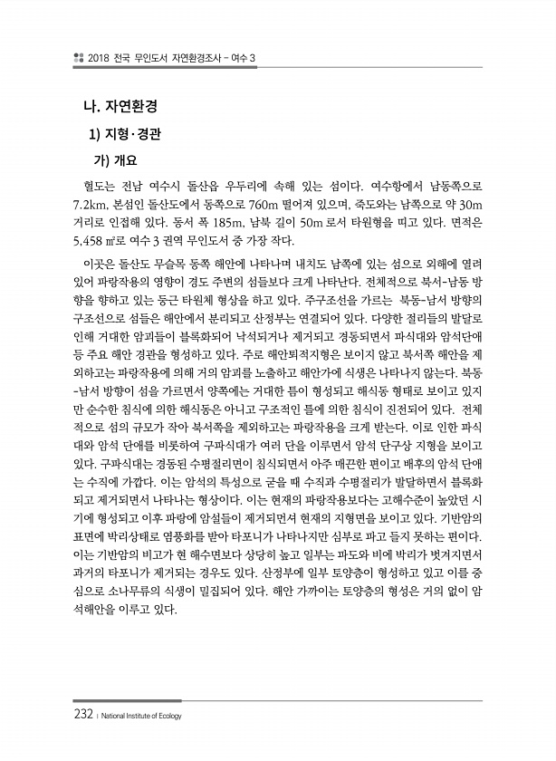 2018 전국 무인도서 자연환경조사 여수 3 232 ? National Institute of Ecology 1 · 혈도는 전남 여수시 돌산읍 우두리에 속해 있는 섬이다. 여수항에서 남동쪽으로 7.2km, 본섬인 돌산도에서 동쪽으로 760m 떨어져 있으며, 죽도와는 남쪽으로 약 30m 거리로 인접해 있다. 동서 폭 185m, 남북 길이 50m 로서 타원형을 띠고 있다. 면적은 5,458 ㎡로 여수 3 권역 무인도서 중 가장 작다. 이곳은 돌산도 무슬목 동쪽 해안에 나타나며 내치도 남쪽에 있는 섬으로 외해에 열려 있어 파랑작용의 영향이 경도 주변의 섬들보다 크게 나타난다. 전체적으로 북서-남동 방 향을 향하고 있는 둥근 타원체 형상을 하고 있다. 주구조선을 가르는 북동-남서 방향의 구조선으로 섬들은 해안에서 ...