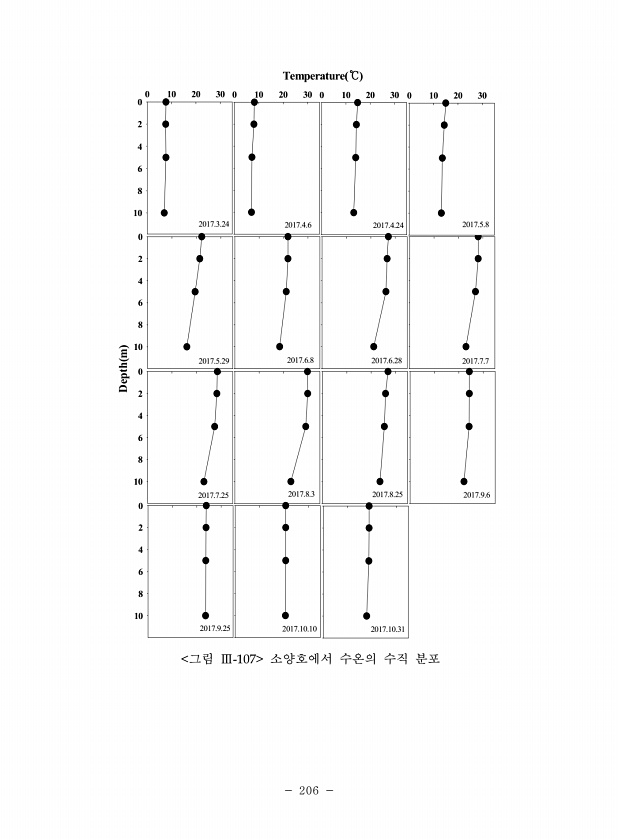 206 0 10 20 30 0 2 4 6 8 10 Temperature ℃ 0 10 20 30 0 10 20 30 Depth m 0 2 4 6 8 10 2017.3.24 2017.4.6 2017.4.24 2017.6.8 2017.6.28 0 2 4 6 8 10 0 2 4 6 8 10 0 10 20 30 2017.5.8 2017.5.29 2017.7.7 2017.7.25 2017.8.3 2017.8.25 2017.9.6 2017.9.25 2017.10.10 2017.10.31 그림 Ⅲ-107 소양호에서 수온의 수직분포