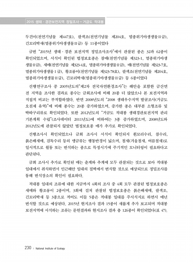 2015 생태·경관보전지역 정밀조사 거금도 적대봉 230 ? National Institute of Ecology 두견이 천연기념물 제447호 , 팔색조 천연기념물 제204호, 멸종위기야생생물Ⅱ급 , 긴꼬리딱새 멸종위기야생생물Ⅱ급 등 11종이었다 금번 “2015년 생태·경관 보전지역 정밀조사조사”에서 관찰된 종은 32과 62종이 확인되었으며, 서식이 확인된 법정보호종은 참매 천연기념물 제323-1, 멸종위기야생 생물Ⅱ급 , 새매 천연기념물 제323-4호, 멸종위기야생생물Ⅱ급 , 매 천연기념물 제323-7호, 멸종위기야생생물Ⅰ급 , 황조롱이 천연기념물 제323-78호 , 팔색조 천연기념물 제204호, 멸종위기야생생물Ⅱ급 , 긴꼬리딱새 멸종위기야생생물Ⅱ급 등 6종이었다 선행연구조사 중 2005년도의“제2차 전국...