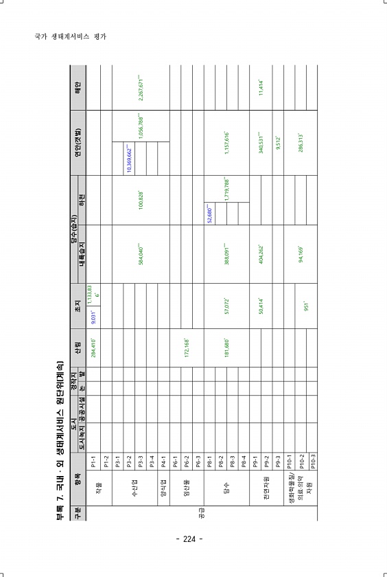 구분 항목 도시 경작지 산림 초지 담수 습지 연안 갯벌 해안 도시녹지 공공시설 논 밭 내륙습지 하천 공급 작물 P1-1 284,410* 9,031* 1,133,83 6* P1-2 수산업 P3-1 584,040*** 100,828* 1,056,788*** 2,267,671*** P3-2 10,369,662*** P3-3 P3-4 양식업 P4-1 임산물 P6-1 P6-2 172,168* P6-3 담수 P8-1 181,680* 57,072* 388,091*** 52,680*** 1,719,788** 1,157,616* P8-2 P8-3 P8-4 천연자원 P9-1 50,414* 404,262* 340,531*** 11,414* P9-2 P9-3 9,512* 생화학물질/ 의료·의약 자원 P10-1 P10-2 94,1...