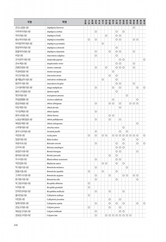240 큰깃노랑밤나방 Amphipoea burrowsi ○ 지옥까마귀밤나방 Amphipyra erebina ○ ○ ○ 까마귀밤나방 Amphipyra livida ○ ○ ○ 흰눈까마귀밤나방 Amphipyra monolitha ○ ○ ○ ○ ○ ○ 피라밑까마귀밤나방 Amphipyra pyramidea ○ 흰점까마귀밤나방 Amphipyra schrenckii ○ 흰줄까마귀밤나방 Amphipyra triparatita ○ ○ ○ ○ ○ 버짐나방 Anacronicta caliginea ○ ○ 오이금무늬밤나방 Anadevidia peponis ○ ○ ○ 큰녹색밤나방 Anaplectoides virens ○ ○ ○ 큰붉은잎밤나방 Anomis commoda ○ ○ ○ ○ ○ ○ 무궁화잎밤나방 Anomis mesogona ...