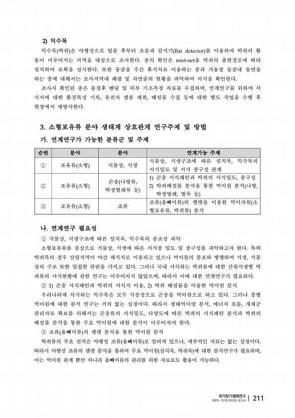 순번 분야 분야 연계가능 주제 포유류 소형 식물상 식생 식물상 식생구조에 따른 설치목 익수목의 서식밀도 및 서식 종구성 관계 포유류 소형 곤충 나방류 딱정벌레목 등 곤충 서식패턴과 박쥐의 서식밀도 종구성 박쥐배설물 분석을 통한 먹이원 분석 나방 딱정벌레 벌목 등 포유류 소형 조류 조류 올빼미류 의 펠렛을 이용한 먹이자원 소 형포유류 박쥐류 분석 익수목 익수목 박쥐 은 야행성으로 일몰 후부터 초음파 감지기 를 이용하여 박쥐의 활 동이 이루어지는 지역을 대상으로 조사한다 종의 확인은 을 박쥐의 출현경로에 따라 설치하여 포획을 실시한다 또한 동굴을 주간 휴식처로 이용하는 종과 겨울철 동굴내 동면을 하는 종에 대해서는 조사지역내 폐광 및 자연굴의 현황을 파악하여 서식을 확인한다 조사시 확인된 종은 동정후 밴딩 및 ...