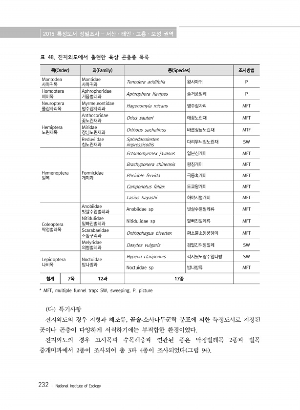 2015 특정도서 정밀조사 서산·태안·고흥·보성 권역 232 ? National Institute of Ecology 목 Order 과 Family 종 Species 조사방법 Mantodea 사마귀목 Mantidae 사마귀과 Tenodera aridifolia 왕사마귀 P Homoptera 매미목 Aphrophoridae 거품벌레과 Aphrophora flavipes 솔거품벌레 P Neuroptera 풀잠자리목 Myrmeleontidae 명주잠자리과 Hagenomyia micans 명주잠자리 MFT Hemiptera 노린재목 Anthocoridae 꽃노린재과 Orius sauteri 애꽃노린재 MFT Miridae 장님노린재과 Orthops sachalinus 바른장님노린재 MTF Reduviidae 침노린...