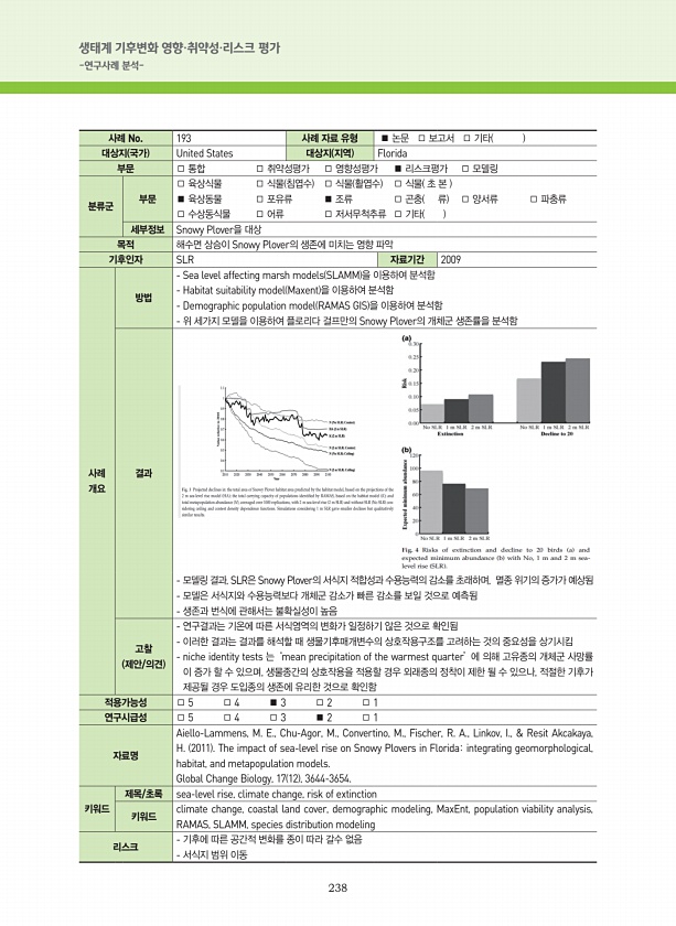 238 생태계 기후변화 영향·취약성·리스크 평가 -연구사례 분석- 사례 No. 193 사례 자료 유형 ■ 논문 □ 보고서 □ 기타 대상지 국가 United States 대상지 지역 Florida 부문 □ 통합 □ 취약성평가 □ 영향성평가 ■ 리스크평가 □ 모델링 분류군 부문 □ 육상식물 □ 식물 침엽수 □ 식물 활엽수 □ 식물 초 본 ■ 육상동물 □ 포유류 ■ 조류 □ 곤충 류 □ 양서류 □ 파충류 □ 수상동식물 □ 어류 □ 저서무척추류 □ 기타 세부정보 Snowy Plover을 대상 목적 해수면 상승이 Snowy Plover의 생존에 미치는 영향 파악 기후인자 SLR 자료기간 2009 사례 개요 방법 Sea level affecting marsh models SLAMM 을 이용하여 분석함 Habitat s...