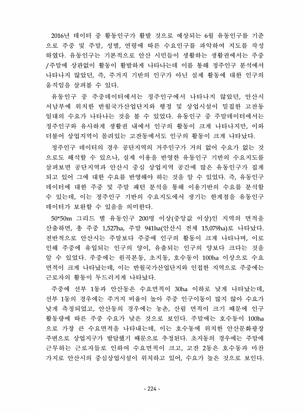 2016년 데이터 중 활동인구가 활발 것으로 예상되는 6월 유동인구를 기준 으로 주중 및 주말, 성별, 연령에 따른 수요인구를 파악하여 지도를 작성 하였다. 유동인구는 기본적으로 안산 시민들이 생활하는 생활권에서는 주중 /주말에 상관없이 활동이 활발하게 나타나는데 이를 통해 정주인구 분석에서 나타나지 않았던, 즉, 주거지 기반의 인구가 아닌 실제 활동에 대한 인구의 움직임을 살펴볼 수 있다. 유동인구 중 주중데이터에서는 정주인구에서 나타나지 않았던, 안산시 서남부에 위치한 반월국가산업단지와 행정 및 상업시설이 밀집한 고잔동 일대의 수요가 나타나는 것을 볼 수 있었다. 유동인구 중 주말데이터에서는 정주인구와 유사하게 생활권 내에서 인구의 활동이 크게 나타나지만, 이와 더불어 상업지역이 몰려있는 고잔동에서도 인...