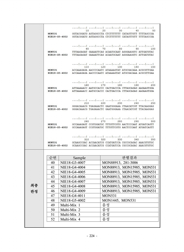 224 최종 판정 순번 Sample 판별결과 40 NIE18-G3-4007 MON88913, 281-3006 41 NIE18-G4-4004 MON88913, MON15985, MON531 42 NIE18-G4-4005 MON88913, MON15985, MON531 43 NIE18-G4-4006 MON88913, MON15985, MON531 44 NIE18-G4-4007 MON88913, MON15985, MON531 45 NIE18-G4-4008 MON88913, MON15985, MON531 46 NIE18-G4-4009 MON88913, MON15985, MON531 47 NIE18-G4-4011 MON531 48 NIE18-G5-4002 MON1445, MON531 49 Multi-Mix 1 음성 ...