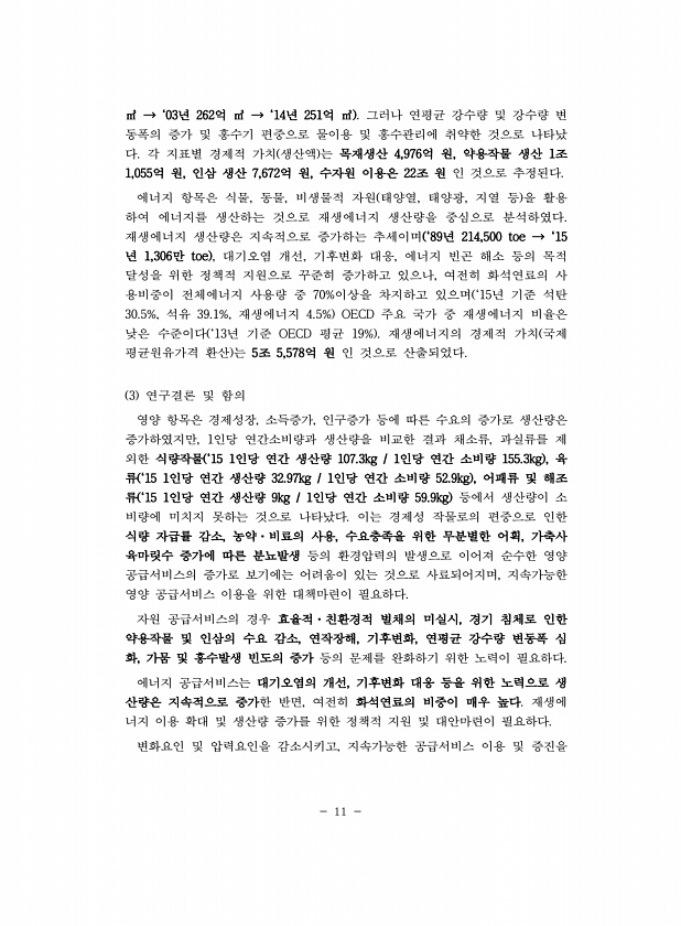 11 ㎥ → `03년 262억 ㎥ → `14년 251억 ㎥ 그러나 연평균 강수량 및 강수량 변 동폭의 증가 및 홍수기 편중으로 물이용 및 홍수관리에 취약한 것으로 나타났 다. 각 지표별 경제적 가치 생산액 는 목재생산 4,976억 원, 약용작물 생산 1조 1,055억 원, 인삼 생산 7,672억 원, 수자원 이용은 22조 원 인 것으로 추정된다. 에너지 항목은 식물, 동물, 비생물적 자원 태양열, 태양광, 지열 등 을 활용 하여 에너지를 생산하는 것으로 재생에너지 생산량을 중심으로 분석하였다. 재생에너지 생산량은 지속적으로 증가하는 추세이며 `89년 214,500 toe → `15 년 1,306만 toe , 대기오염 개선, 기후변화 대응, 에너지 빈곤 해소 등의 목적 달성을 위한 정책적 지원으로 꾸준히 증가...