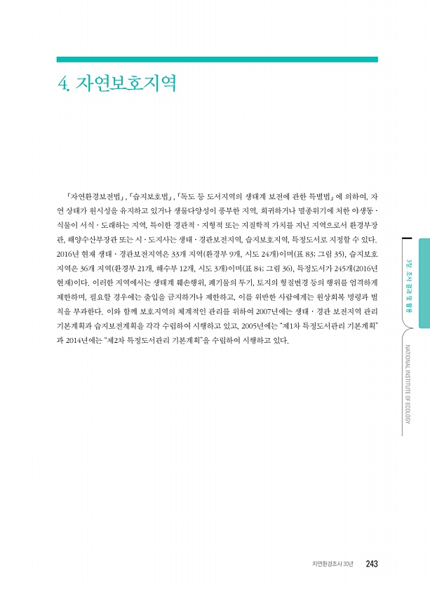 3장. 조사 결과 및 활용 NATIONAL INSTITUTE OF ECOLOGY 자연환경조사 30년 243 「자연환경보전법」 , 「습지보호법」 , 「독도 등 도서지역의 생태계 보전에 관한 특별법」 에 의하여, 자 연 상태가 원시성을 유지하고 있거나 생물다양성이 풍부한 지역, 희귀하거나 멸종위기에 처한 야생동 · 식물이 서식 · 도래하는 지역, 특이한 경관적 · 지형적 또는 지질학적 가치를 지닌 지역으로서 환경부장 관, 해양수산부장관 또는 시 · 도지사는 생태 · 경관보전지역, 습지보호지역, 특정도서로 지정할 수 있다. 2016년 현재 생태 · 경관보전지역은 33개 지역 환경부 9개, 시도 24개 이며 표 83; 그림 35 , 습지보호 지역은 36개 지역 환경부 21개, 해수부 12개, 시도 3개 이며 표 8...