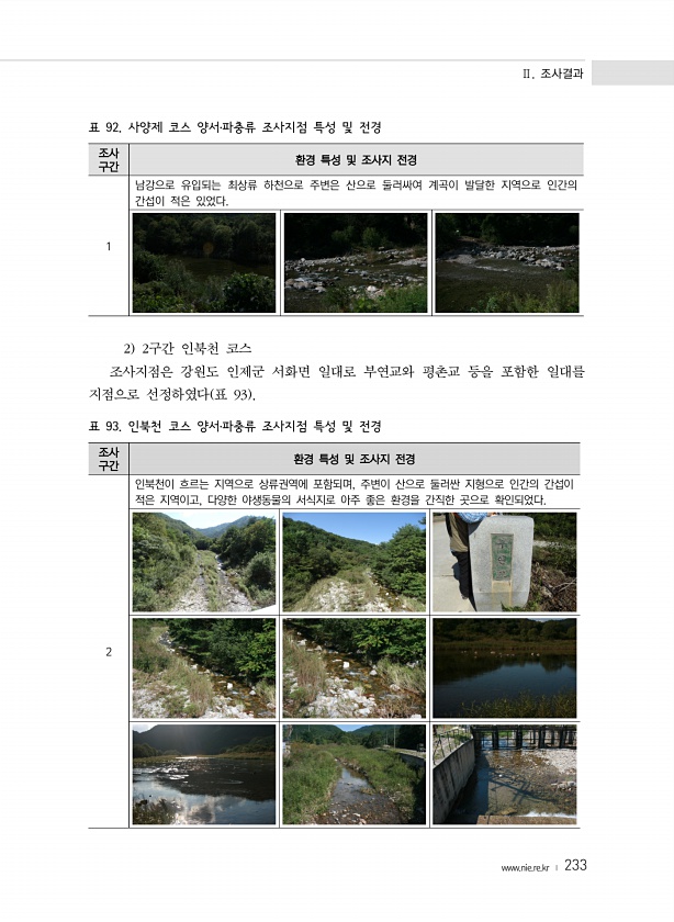 Ⅱ. 조사결과 www.nie.re.kr ? 233 조사 구간 환경 특성 및 조사지 전경 1 남강으로 유입되는 최상류 하천으로 주변은 산으로 둘러싸여 계곡이 발달한 지역으로 인간의 간섭이 적은 있었다. 표 92. 사양제 코스 양서?파충류 조사지점 특성 및 전경 2 2구간 인북천 코스 조사지점은 강원도 인제군 서화면 일대로 부연교와 평촌교 등을 포함한 일대를 지점으로 선정하였다 표 93 조사 구간 환경 특성 및 조사지 전경 2 인북천이 흐르는 지역으로 상류권역에 포함되며, 주변이 산으로 둘러싼 지형으로 인간의 간섭이 적은 지역이고, 다양한 야생동물의 서식지로 아주 좋은 환경을 간직한 곳으로 확인되었다. 표 93. 인북천 코스 양서?파충류 조사지점 특성 및전경