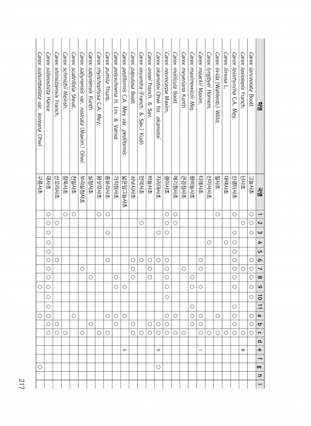 217 학명 국명 1 2 3 4 5 6 7 8 9 10 11 a b c d e f g h i Carex lanceolata Boott 그늘사초 ○ ○ ○ ○ ○ ○ ○ ○ ○ ○ ○ Carex lasiolepis Franch. 난사초 ○ ○ ○ Ⅲ Carex leiorhyncha C.A. Mey. 산괭이사초 ○ ○ ○ ○ ○ ○ ○ ○ ○ ○ ○ ○ Carex limosa L. 대택사초 ○ ○ Carex livida Wahlenb. Willd. 밀사초 ○ ○ ○ Carex lyngbyei Hornem. 산이삭사초 ○ ○ Carex maackii Maxim. 타래사초 ○ ○ ○ ○ ○ ○ Ⅰ Carex maximowiczii Miq. 왕비늘사초 ○ ○ ○ ○ ○ Carex meyeriana Kunth 큰검정사...