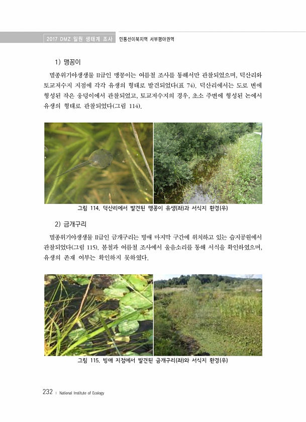 2017 DMZ 일원 생태계 조사 민통선이북지역 서부평야권역 232 ? National Institute of Ecology 1 맹꽁이 멸종위기야생생물 II급인 맹꽁이는 여름철 조사를 통해서만 관찰되었으며, 덕산리와 토교저수지 지점에 각각 유생의 형태로 발견되었다 표 74 덕산리에서는 도로 변에 형성된 작은 웅덩이에서 관찰되었고, 토교저수지의 경우, 초소 주변에 형성된 논에서 유생의 형태로 관찰되었다 그림 114 그림 114. 덕산리에서 발견된 맹꽁이 유생 좌 과 서식지 환경 우 2 금개구리 멸종위기야생생물 II급인 금개구리는 빙애 마지막 구간에 위치하고 있는 습지공원에서 관찰되었다 그림 115 봄철과 여름철 조사에서 울음소리를 통해 서식을 확인하였으며, 유생의 존재 여부는 확인하지 못하였다. 그림 115....