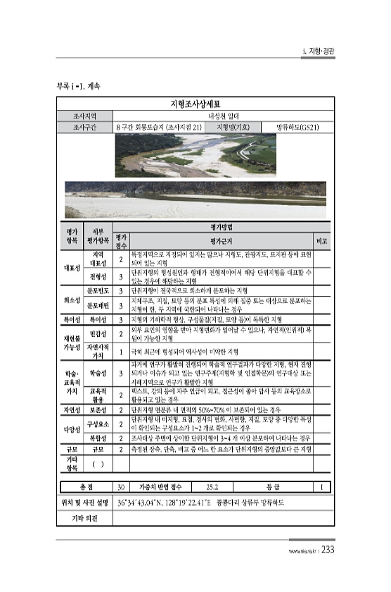i. 지형·경관 www.nie.re.kr ?233 지형조사상세표 조사지역 내성천 일대 조사구간 8 구간 회룡포습지 조사지점 21 지형명 기호 망류하도 GS21 평가 항목 세부 평가항목 평가방법 평가 점수 평가근거 비고 대표성 지역 대표성 2 특정지역으로 지정되어 있지는 않으나 지형도, 관광지도, 표지판 등에 표현 되어 있는 지형 전형성 3 단위지형의 형성원인과 형태가 전형적이어서 해당 단위지형을 대표할 수 있는 경우에 해당하는 지형 희소성 분포빈도 3 단위지형이 전국적으로 희소하게 분포하는 지형 분포패턴 3 지체구조, 지질, 토양 등의 분포 특성에 의해 집중 또는 대상으로 분포하는 지형이 한, 두 지역에 국한되어 나타나는 경우 특이성 특이성 3 지형의 기하학적 형상, 구성물질 지질, 토양 등 이 독특한 지형...