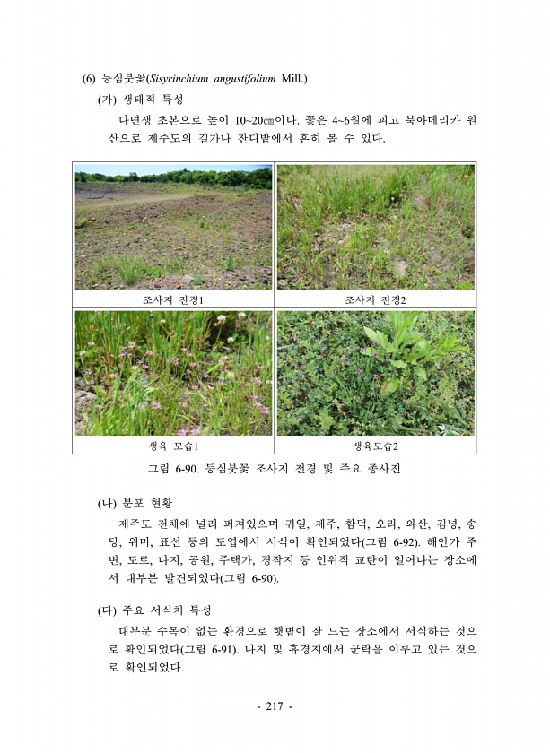 217 6 등심붓꽃 Sisyrinchium angustifolium Mill. 가 생태적 특성 다년생 초본으로 높이 1020㎝이다. 꽃은 46월에 피고 북아메리카 원 산으로 제주도의 길가나 잔디밭에서 흔히 볼 수 있다. 조사지 전경1 조사지 전경2 생육 모습1 생육모습2 그림 6-90. 등심붓꽃 조사지 전경 및 주요 종사진 나 분포 현황 제주도 전체에 널리 퍼져있으며 귀일, 제주, 함덕, 오라, 와산, 김녕, 송 당, 위미, 표선 등의 도엽에서 서식이 확인되었다 그림 6-92 해안가 주 변, 도로, 나지, 공원, 주택가, 경작지 등 인위적 교란이 일어나는 장소에 서 대부분 발견되었다 그림 6-90 다 주요 서식처 특성 대부분 수목이 없는 환경으로 햇볕이 잘 드는 장소에서 서식하는 것으 로 확인되었다 그림 6...
