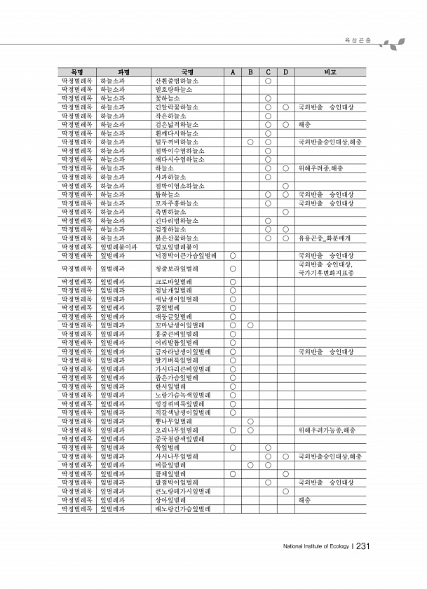 육 상 곤 충 National Institute of EcologyⅠ231 목명 과명 국명 A B C D 비고 딱정벌레목 하늘소과 산흰줄범하늘소 ○ 딱정벌레목 하늘소과 벌호랑하늘소 딱정벌레목 하늘소과 꽃하늘소 ○ 딱정벌레목 하늘소과 긴알락꽃하늘소 ○ ○ 국외반출 승인대상 딱정벌레목 하늘소과 작은하늘소 ○ 딱정벌레목 하늘소과 검은넓적하늘소 ○ ○ 해충 딱정벌레목 하늘소과 흰깨다시하늘소 ○ 딱정벌레목 하늘소과 털두꺼비하늘소 ○ ○ 국외반출승인대상,해충 딱정벌레목 하늘소과 점박이수염하늘소 ○ 딱정벌레목 하늘소과 깨다시수염하늘소 ○ 딱정벌레목 하늘소과 하늘소 ○ ○ 위해우려종,해충 딱정벌레목 하늘소과 사과하늘소 ○ 딱정벌레목 하늘소과 점박이염소하늘소 ○ 딱정벌레목 하늘소과 톱하늘소 ○ ○ 국외반출 승인대상 딱정벌레...